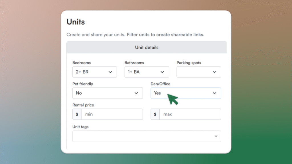 We’ve added “Dens/Office” as a filter in the Units view to see which spaces have dedicated work areas quickly.
